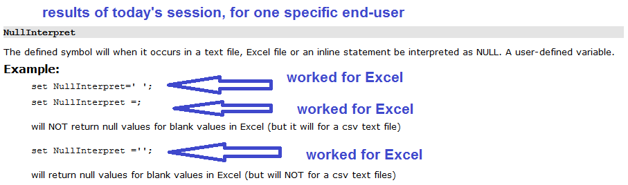 The above has trapped Excel blanks in the past, but I'm currently observing a disconnect (I've tested by trying all the documented variants for suggested settings of the NullInterpret variable. this capability still seems functional in conjunction with flat-files, only Excel intake seems impacted).