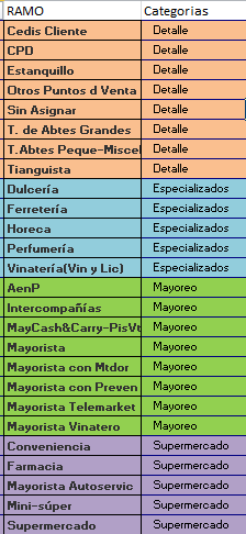 if('AenP' and RAMO='Intercompañías' and RAMO='MayCash&Carry-PisVta' and RAMO='Mayorista' and RAMO='Mayorista con Mtdor'and RAMO='Mayorista con Preven' and RAMO='Mayorista Telemarket'and RAMO='Mayorista Vinatero') as Mayoreo,