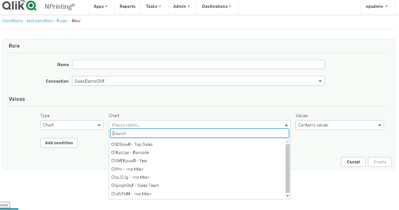 I created a Nprinting Report, when i try to apply Rule Condition dont see the chart ID in the value list,then i cant create this rule.
