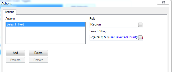 Try in document properties Add a trigger OnAnySelect and select Action Select in Field and use Field=Region and value='APAC'.