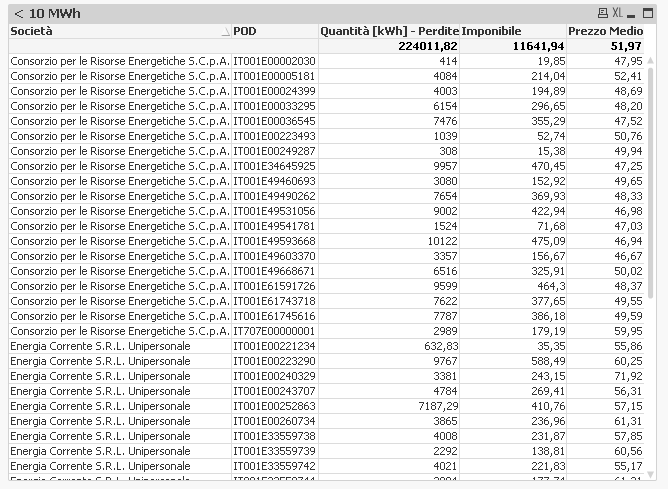 I have to calculate the TOTAL average price (Column called 'Prezzo Medio') dividing the sum of field 'Imponibile' by the sum of field 'Quantità[kWh]-Perdite'.