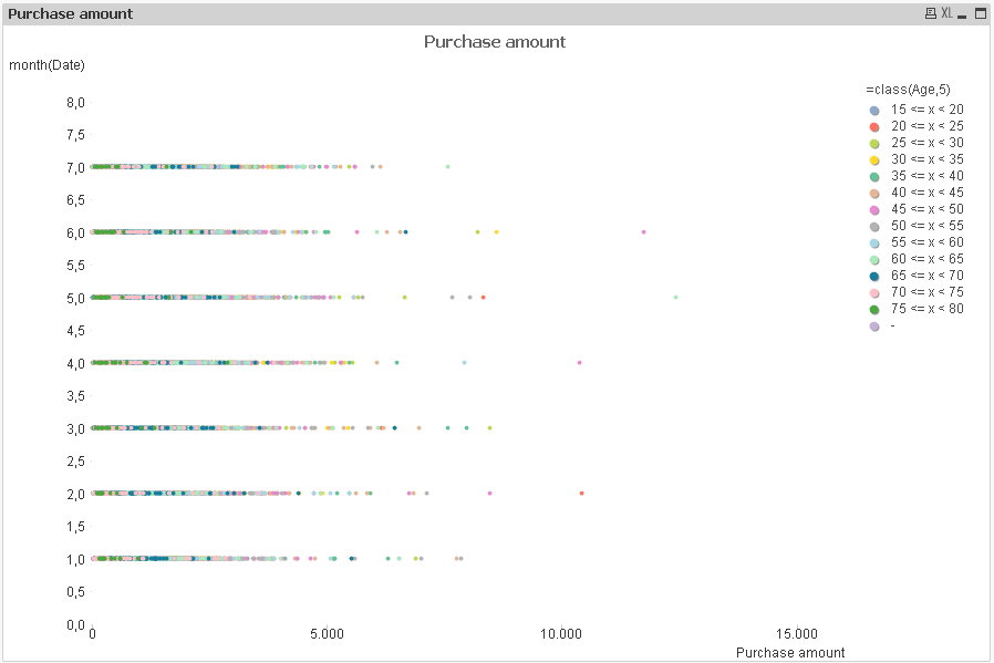 I want to create a scatter chart but I am facing lots of difficulties. I have some age ranges of our customers (20-30,30-40,40-50 etc) and I want to see in a scatter chart, all of those purchases in terms of Price amount. For example, by the 1-1-2013, 1000 purchases have happened. I want to see 1000 dots in a chart, where every dot will have a color that represents the age range, the X-axis will be amount of purchase and the Y-axis will be the time.
