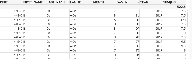 HOURS is the Field name but I want to total the HOURS. In the data set you can have a zero hours logged in one project and 8 hours logged in the other. The way I have the formula it will still show me the MONTH because there is a zero showing in that DAY, so i want to total the HOURS for the day so this doesn't show up.